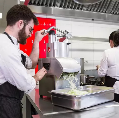 Maskinen leverer et perfekt og jevnt resultat takket være presise justeringer og et bredt spekter av skiver og rister. Ved å kombinere tilbehør kan du oppnå mer enn 70 ulike kutte- og rivetyper. Det avanserte kuttehodet, med blad på én side, fordeler produktene optimalt og gjør det enkelt å kutte hele produkter som kål. Den høyejektor-utrustede løsningen sikrer rask og effektiv utmating, selv ved maksimal belastning.