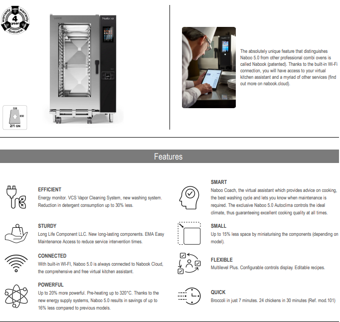 Den helt unike funksjonen som skiller Naboo fra andre profesjonelle ovner kalles Cloud. I Cloud finner du alt av informasjon som trengs for å lage det ferdige produktet. Dette er satt i et system der oppskriftene, fremgangsmåten og presentasjon av hver enkelt rett finnes i skyen. Naboo redefinerer alt du har lært om en kombidamper og tar deg inn i fremtiden. Ovnen gir utmerket kvalitet på resultatet og kommer i flere forskjellige størrelser og prisgrupper.