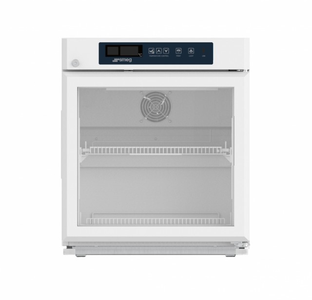 Profesjonelt kjøleskap med glassdør og anti-kondensasjon, 55 liter kapasitet. Ideelt for laboratorier, helsevesen og små industrielle anvendelser. Temperaturområde +2 til +10 °C.