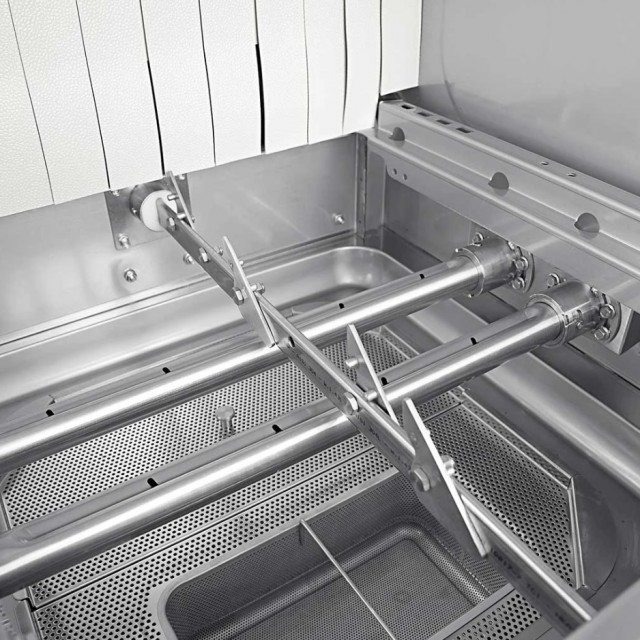 Maskinen er utstyrt med digital visning av temperaturer for tank og kjel, samt automatisk timer som stopper vask og skylling når ingen kurver registreres. Elektriske komponenter og pumpe er lett tilgjengelige fra fronten, mens kjelen er isolert og produsert i AISI 304L rustfritt stål for optimal energieffektivitet.