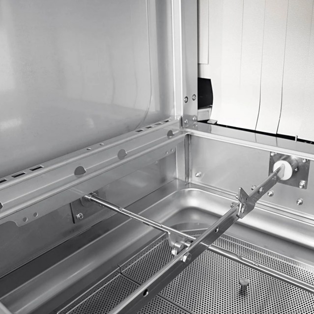 Vaske- og skyllearmene i rustfritt stål kan enkelt tas ut for rengjøring. Vaskekammeret er designet med avrundede kanter og dobbel vegg for maksimal hygiene og stabil drift. Den motbalanserte hevedøren i full bredde har dobbel konstruksjon med sikkerhetsmikrobryter og låsemekanisme. Tankfiltrene i rustfritt stål er lett tilgjengelige og kan tømmes raskt via hendel i front.